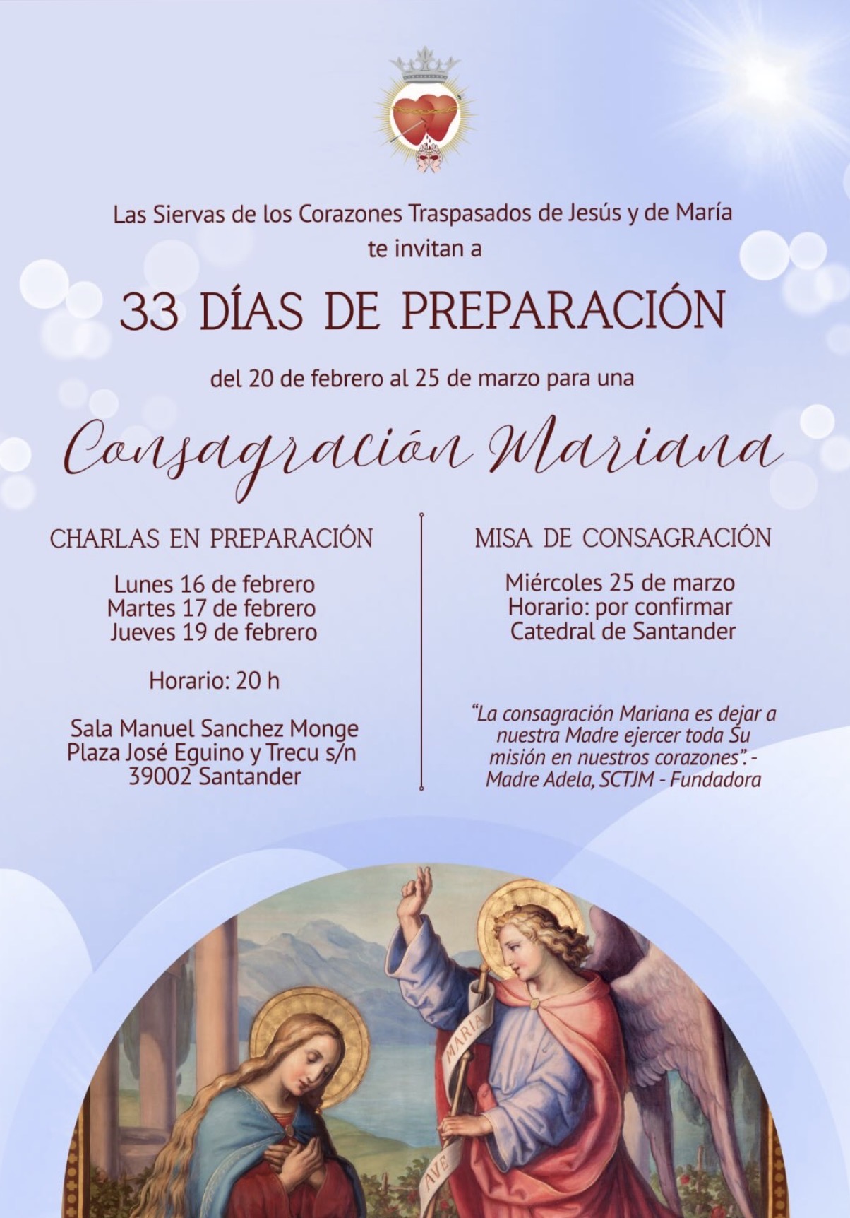 Consagración Mariana – SCTJM + Añadir Google Calendar Exportación + iCal / Outlook 00 días 00 horas 00 minutos 00 segundos Fecha Feb 16 - 17 2026 Hora Evento de todo el día Localización Sala Manuel Sánchez Monge Compartir este evento