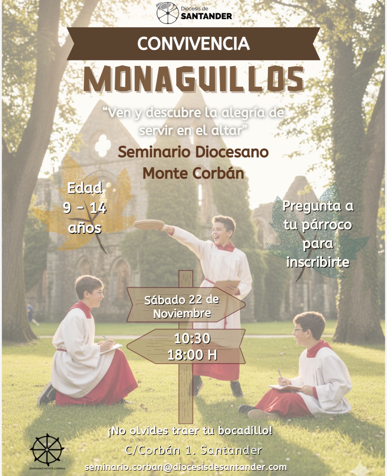Convivencia de monaguillos + Añadir Google Calendar Exportación + iCal / Outlook El evento está en curso. Fecha Nov 22 2025 En curso... Hora 10:30 - 18:00 Localización Seminario de Monte Corbán Santander Compartir este evento