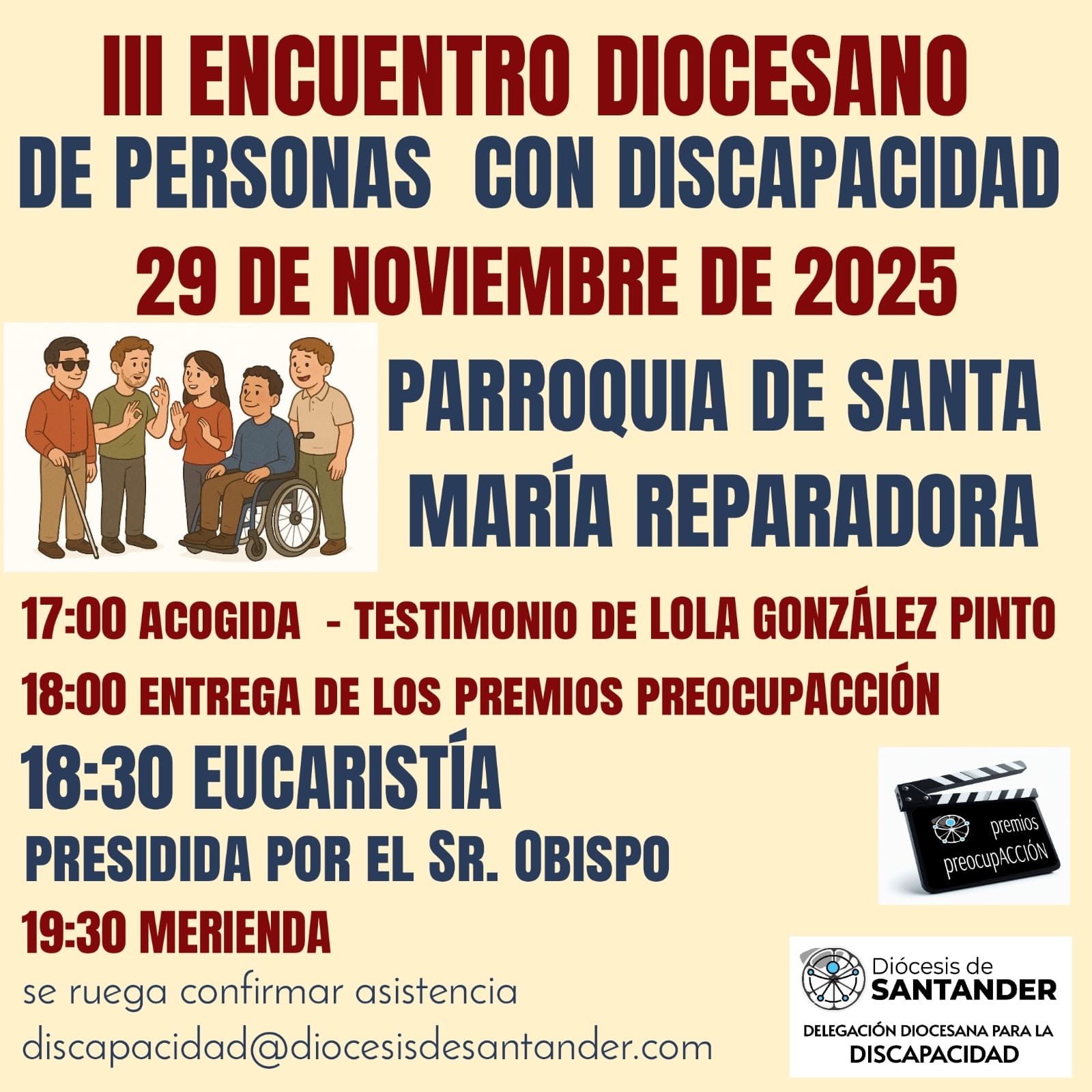 III Encuentro Diocesano de personas con discapacidad + Añadir Google Calendar Exportación + iCal / Outlook 00 días 00 horas 00 minutos 00 segundos Fecha Nov 29 2025 Hora 17:00 Localización Parroquia de Santa María Reparadora Santander Compartir este evento