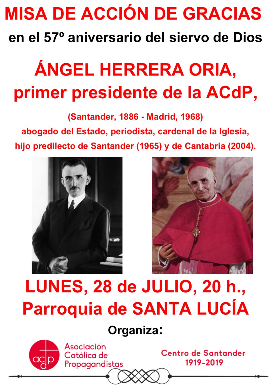 Misa Acción de Gracias – Ángel Herrera Oria Etiquetas: Misa Fecha Jul 28 2025 Finalizado Hora 20:00 - 21:00 Localización Parroquia de Santa Lucía Santander Compartir este evento