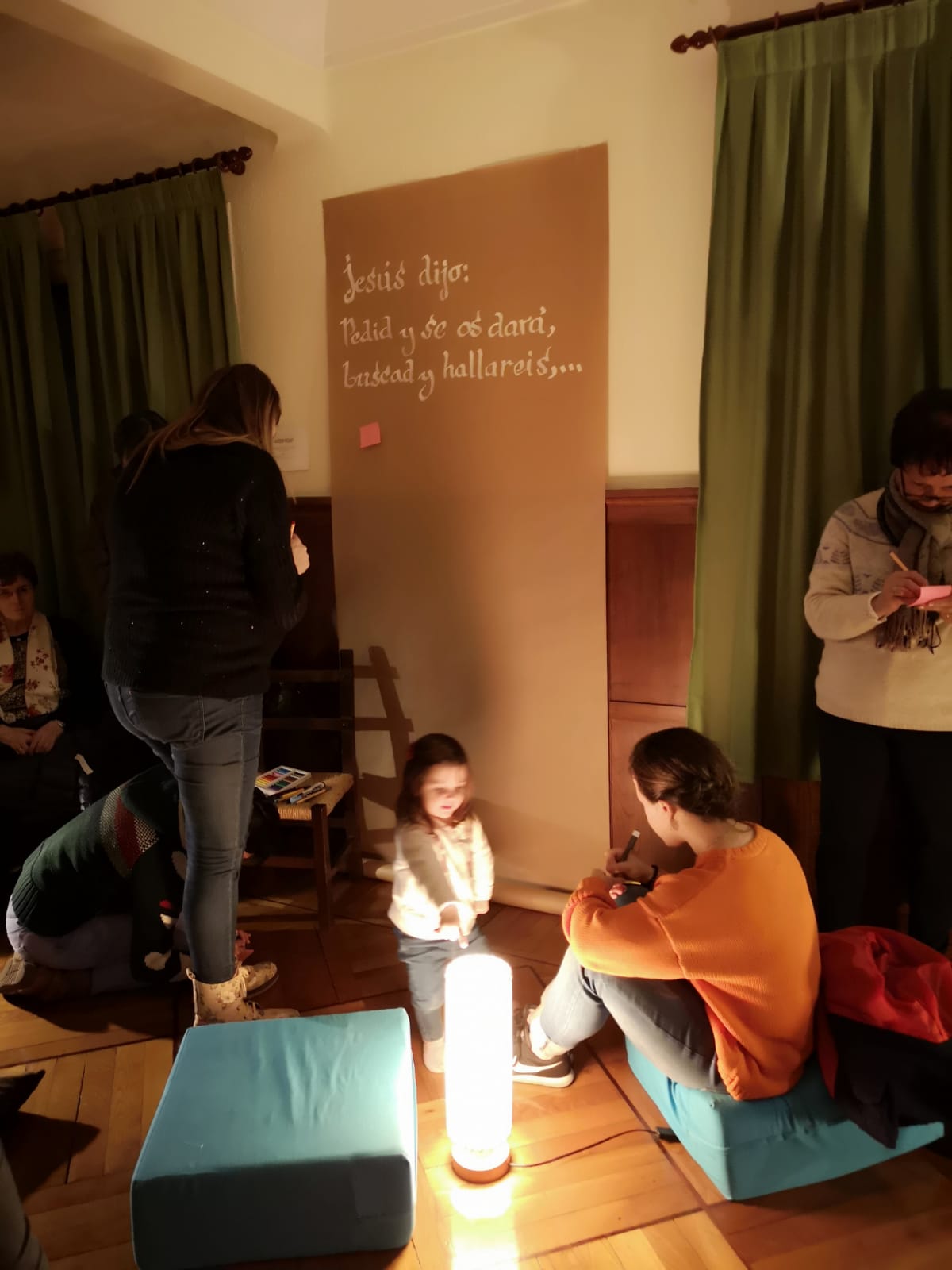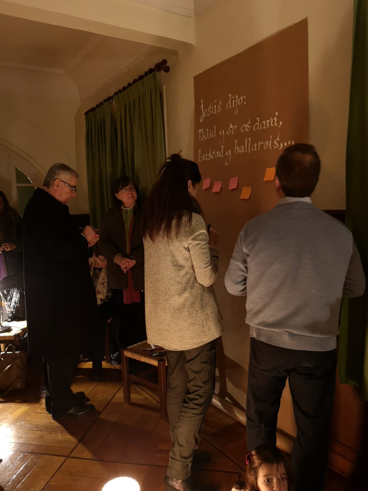 No fue solo compartir el proyecto, sino presentarlo con una sencilla experiencia en la capilla de la Casa de la Iglesia. Con recortes de noticias y un mapa de Cantabria, invitó a orar, cada cual por aquello que sintiese profundamente, poniendo post-its y con dos zonas de oración desde las que situarse, cual ámbitos diferenciados, para pedir y dar gracias, generando unos espacios de libertad en que poder rezar.