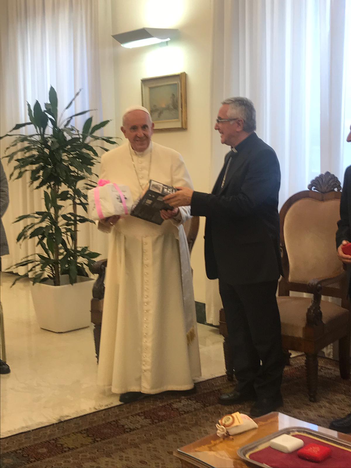 Durante su estancia han hecho diversos regalos al Papa, de productos típicos de nuestra región, entre los que no han faltado sobaos y anchoas. Y, al finalizar la audiencia, el Papa ha regalado a cada uno personalmente un rosario bendecido por él para que puedan rezar por él.