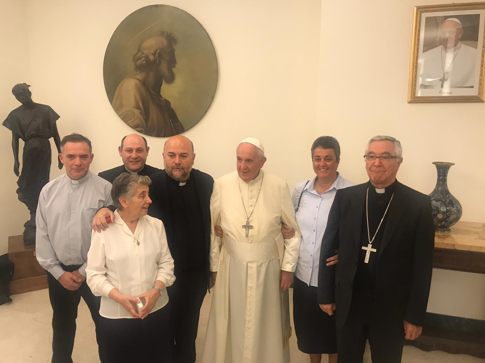 El Santo Padre, el Papa Francisco, se reunió esta tarde con una comitiva que salió esta semana desde Cantabria para poder participar de la Audiencia General de ayer, en la Plaza del Vaticano, y hoy en la audiencia privada que ha concedido con motivo del cuarto de siglo peregrinando los internos del Centro Penitenciario de “El Dueso” al Santuario de Lourdes, acompañando a la Hospitalidad Diocesana de Santander cada semana de Pascua.