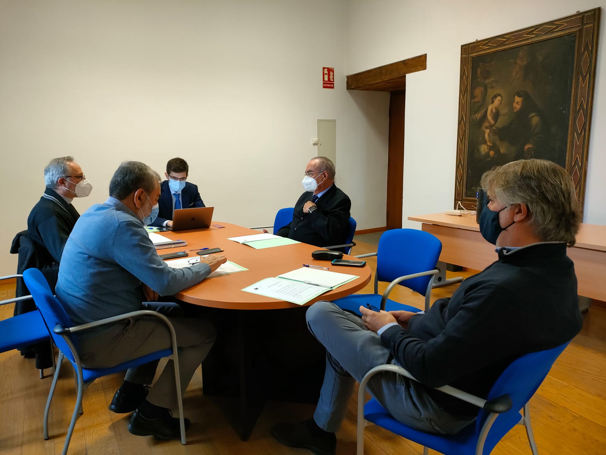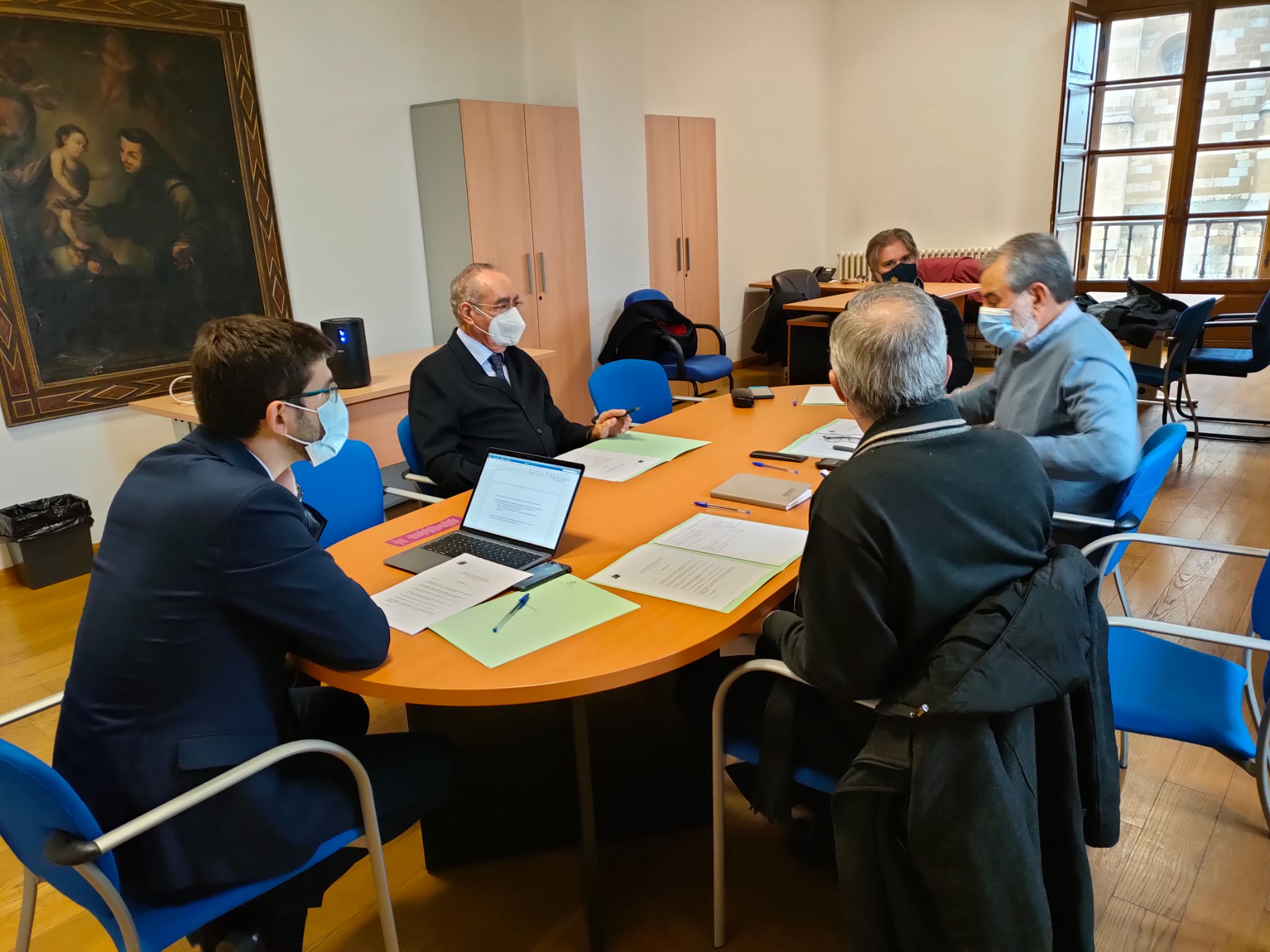 Los ecónomos de las cuatro diócesis de la Provincia Eclesiástica de Oviedo, en la que se integran las diócesis de Oviedo, Astorga, León y Santander, han mantenido esta mañana un encuentro de trabajo en la Sala del Sínodo del Obispado de León para reforzar la respuesta común de la Iglesia frente a la situación de pandemia, en un contexto económico de crisis que está marcado desde hace ya más de un año por una caída estimada en un tercio dentro del capítulo de las donaciones. Un diagnóstico de situación que Vicente Gutiérrez, anfitrión el encuentro y ecónomo de la Diócesis de León, Manuel María Moxó Soto, viceecónomo de la Diócesis de Santander, Antonio Nistal, ecónomo de la Archidiócesis de Oviedo, y Celestino Mielgo Domínguez, ecónomo de la Diócesis de Astorga, pudieron compartir con el director del Secretariado para el Sostenimiento de la Iglesia de la Conferencia Episcopal Española (CEE), José María Albalad, quien enmarcó esta actividad en una ronda de visitas con los responsables económicos de todas las diócesis españolas que se viene desarrollando desde el pasado mes de noviembre.