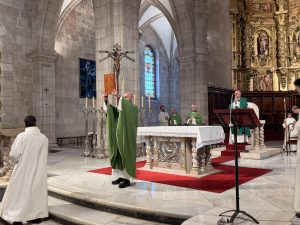 La celebración ha comenzado en la plaza de la Catedral, donde cientos de personas han escuchado el rito y la oración inicial antes de peregrinar recorriendo el claustro del templo hasta su interior. Uno de los últimos recorridos por este lugar este año; un signo que se ha repetido en cada una de las peregrinaciones y que simboliza ese caminar físico y espiritual, camino de renovación.