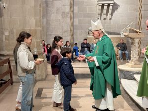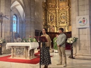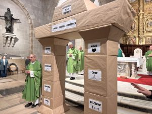 Tras finalizar la Eucaristía y antes de la bendición, varios miembros de la delegación han armado un arco cargado de signos representativos de la Iglesia y de este año de la esperanza: Creer, perdonar; peregrinar, esperar; amar, orar; celebrar y comulgar. Todos ellos coronados por la familia como representante de la Iglesia doméstica y por la esperanza. La celebración ha finalizado con un aperitivo en el claustro de la Catedral.