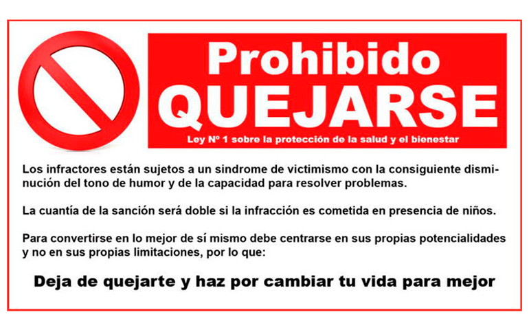 Prohibido quejarse analiza cómo la queja se ha convertido en un recurso habitual en nuestro tiempo y cómo alimenta el clima de negatividad, pero se muestra inútil para afrontar y resolver los problemas.