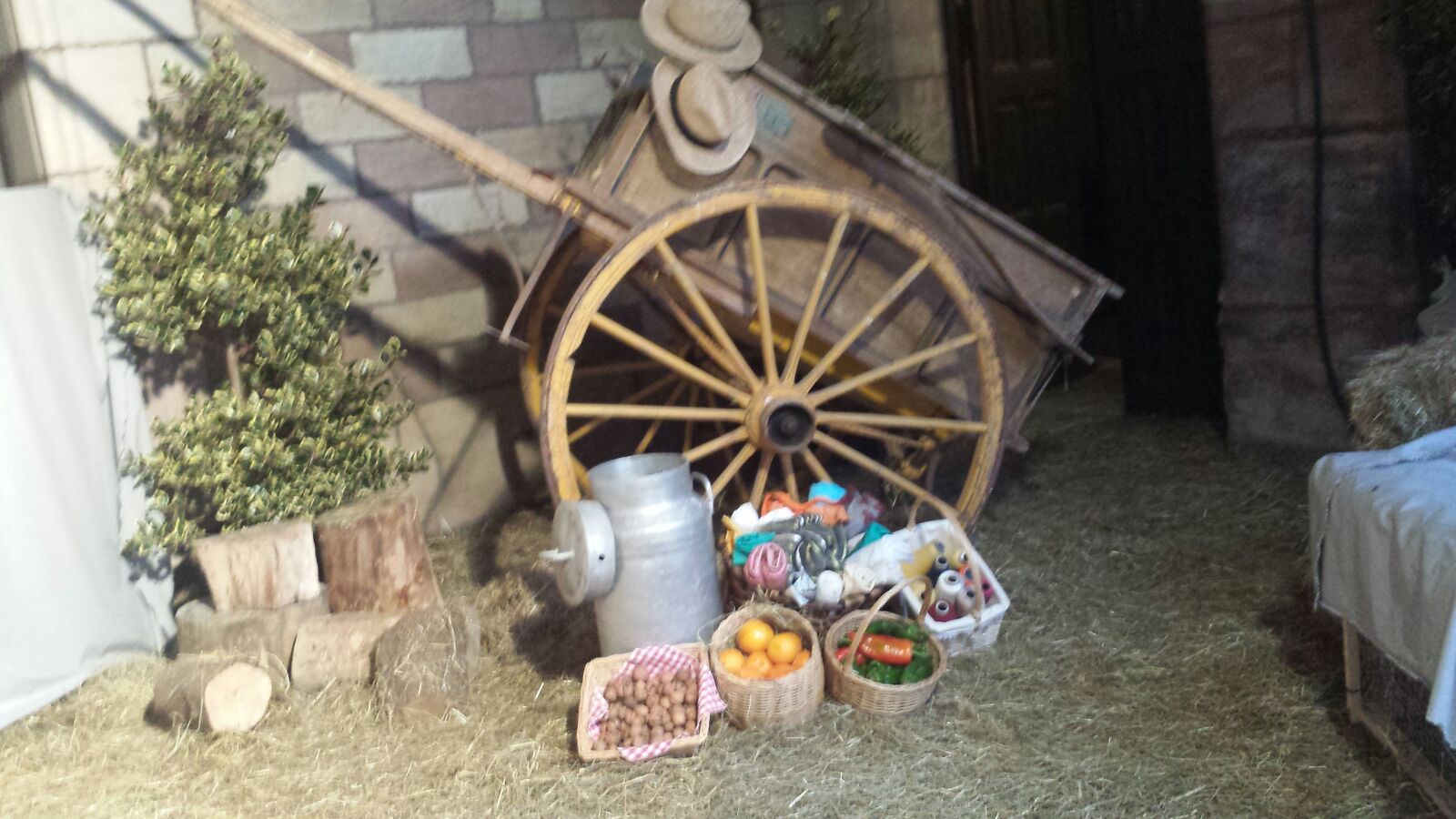 Se han colocado las figuras del Misterio a tamaño natural y el pórtico esta decorado simulando el Portal de Belén con un carro, un pozo, otros complementos rústicos y algunos animales vivos (un conejo y dos gallinas).