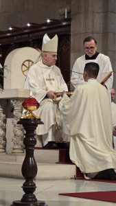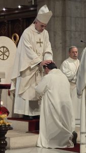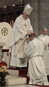 La imposición de las manos es el gesto central y esencial del sacramento del Orden. Es este momento, D. Arturo, en silencio, ha colocado sus manos sobre la cabeza de los candidatos, y mediante este signo visible ha transmitido la gracia del Espíritu Santo, que les ha constituido diáconos.