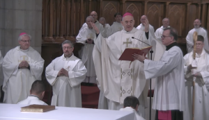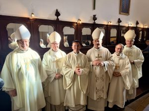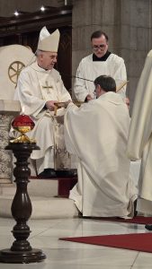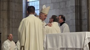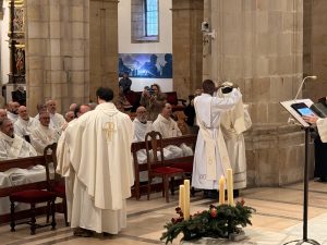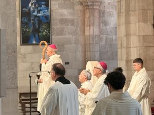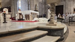 Ambos candidatos se han tumbado frente al altar mientras se han entonado las letanías invocando la intercesión de la Iglesia celestial. Este ha sido uno de los momentos más solemnes y conmovedores de la ordenación. La Iglesia entera, en el cielo y en la tierra, intercede por quien va a recibir el sacramento del Orden. Es un acto de súplica, de humildad y de comunión.