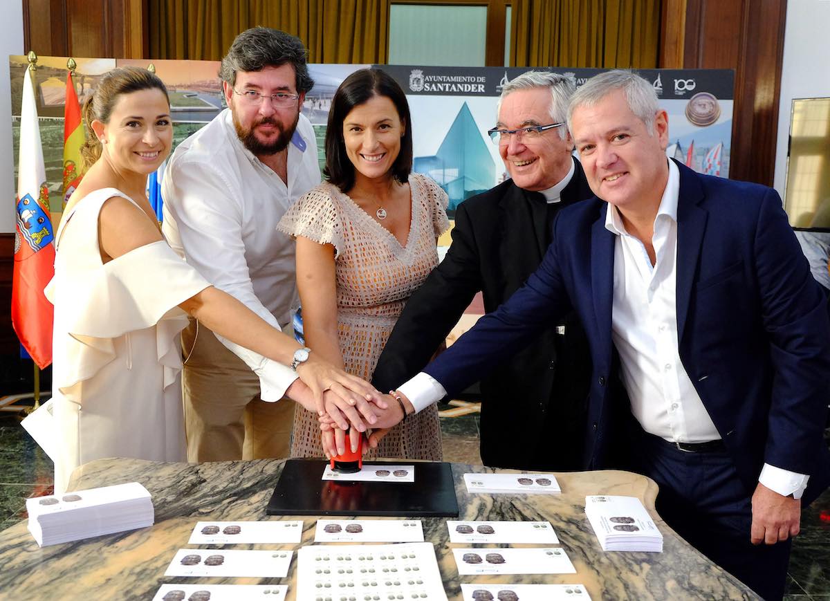 La alcaldesa de Santander, Gema Igual; el obispo de la Diócesis, Mons. Manuel Sánchez Monge; el presidente de la Federación Filatélica de Cantabria, Constantino Ruiz; y el jefe de Oficinas de Correos en Cantabria, Fermín Orizaola, han participado en la presentación.